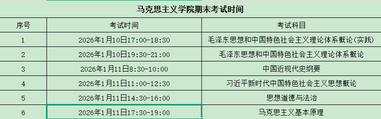 本次期末考试科目共计6门:《毛泽东思想和中国特色社会主义理论体系概论》《毛泽东思想和中国特色社会主义理论体系概论(实践)》《马克思主义基本原理》《中国近现代史纲要》《思想道德与法治》《习近平新时代中国特色社会主义思想概论》。
